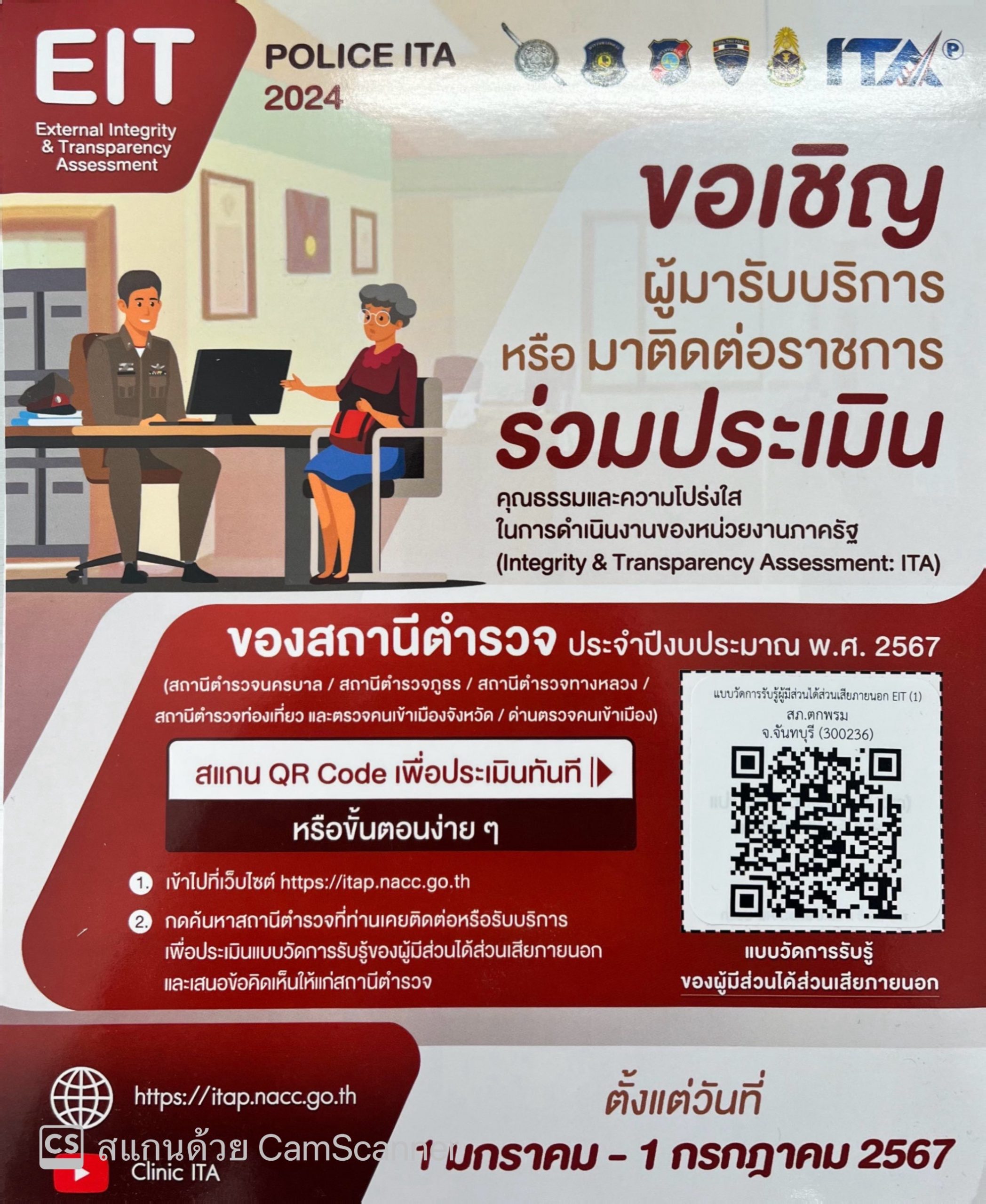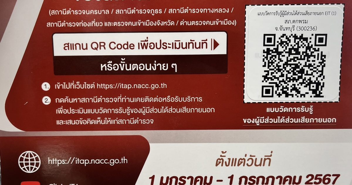 ร่วมประเมิน 15 กันยายน 2565 โดย admtokphrom / ข่าวจัดซื้อจัดจ้าง,งานงบประมาณแผนงาน สถานีตำรวจภูธรตกพรม จังหวัดจันทบุรีขอเชิญชวน ผู้มารับบริการ / มาติดต่อ สถานีตำรวจ ร่วมจัดทำแบบวัดการรับรู้ของผู้มีส่วนได้ส่วนเสียภายนอก(External Integrity & Transparency Assessment: EIT) 2024สำหรับนำไปพัฒนาปรับปรุงการให้บริการของสถานีตำรวจ ด้านคุณภาพการดำเนินงาน ด้านประสิทธิภาพการสื่อสาร และการปรับปรุงระบบการทำงาน กด ทำแบบสอบถาม FacebookFacebookXXLINELine
